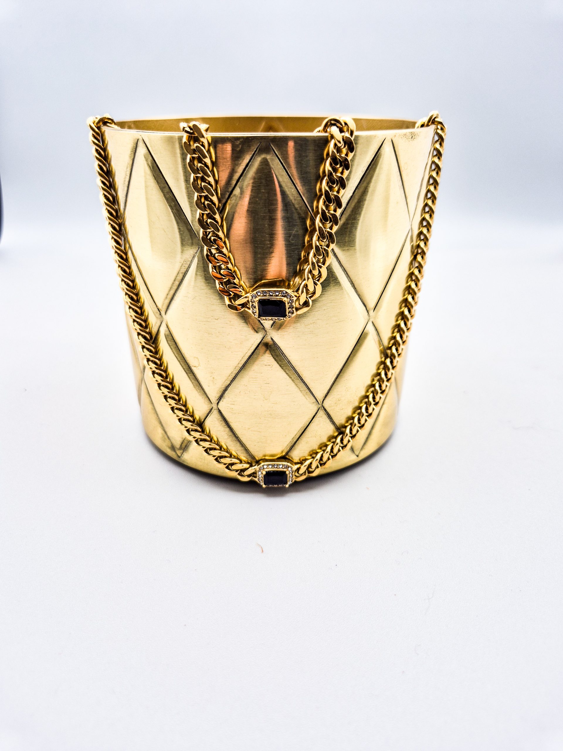 Available in 3 captivating hues — onyx black, champagne crystal, and emerald green, each piece captures a different facet of elegance and strength. The smooth Cuban-link chain drapes effortlessly around the wrist, offering a luxurious weight and fluid movement that exudes quiet power and sophistication.